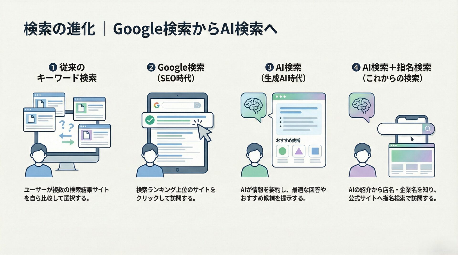AI検索の普及により、検索の流れは次のように変わり始めています。